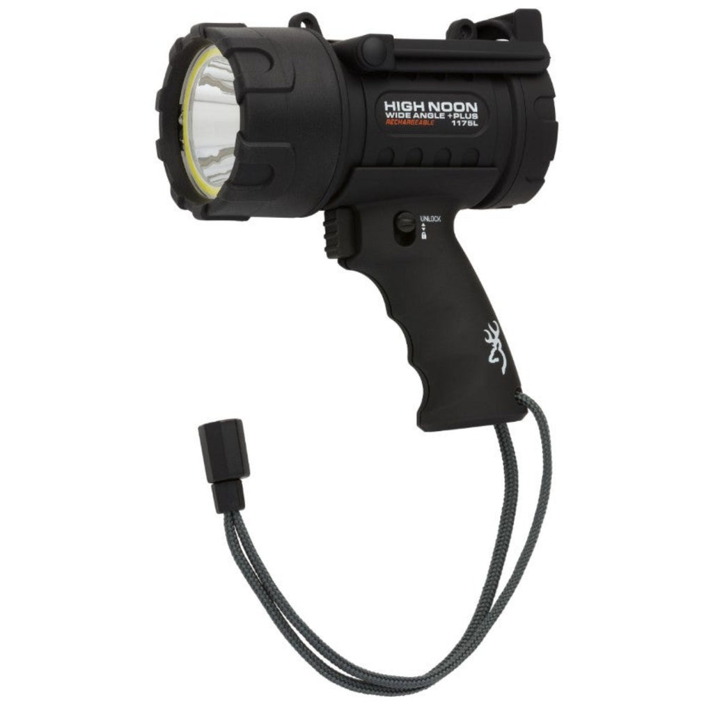 The Browning High Noon USB Rechargeable Spotlight with Wide Angle Plus is a max 1175 lumens spotlight with Wide Angle Plus technology and multiple lighting modes. It reaches up to 550 yards and runs on USB rechargeable Li-ion battery. It includes Power Bank feature and is waterproof, submersible, and floats. It includes 3000 mAh lithium ion battery with color coded charging and power remaining indicator, lanyard, and USB charging cable.