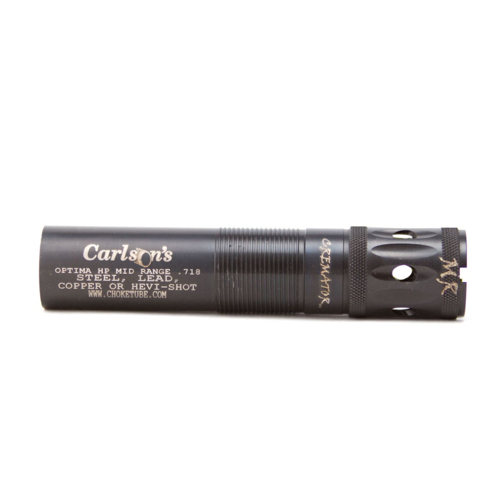 Carlson Cremator Ported 12ga Chokes feature a brand new triple shot technology. TST is a series of three graduated rings in the taper section of the choke tube,that allows for a more gradual transition from the shotgun bore to the final constriction. The Cremator series conveys a host of benefits to the shooter, like reduced pellet deformation, less flyers, and denser patterns. You also get all the benefits of an extended choke tube, including a 25 percent longer parallel section for tighter and more dense patterns, wrench-less installation/quick removal, and muzzle protection. They are offered in your choice of ported or non-ported configurations, with a matte black finish. like all of our choke tubes, the Cremator series carries a lifetime warranty, and are constructed out of premium 17-4 stainless steel. This choke is for mid range and fits Beretta Optima HP models.