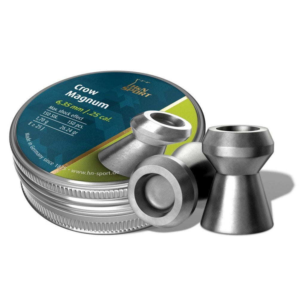 H andN Crow Magnum .25 cal pellets are a medium-weight, hunting pellet with flat trajectory for medium ranges. It features maximum shock effect and deformation of pellets. These pellets are smooth with large hollow point. They are good for small pest control, .25 cal, and come 150 per tin.