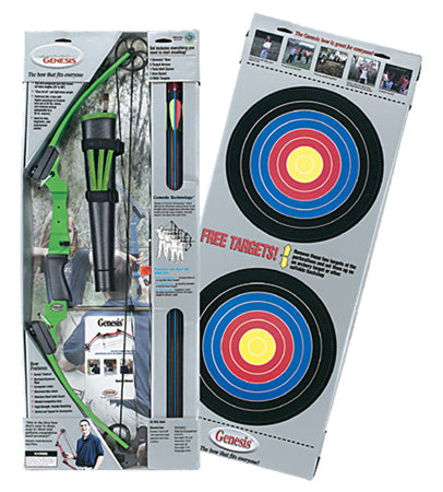 The Genesis System combined "zero let-off" with light draw weights to create a bow that covers all standard draw lengths and fits virtually everyone. This bow has just one cam which means no tuning problems, much less recoil, more accurate shooting, and less noise, and because there's no specific requirement for draw length, kids will never outgrow the bow, they won't develop bad habits due to an ill-fitting bow, and everyone in the family can use the same bow. The kit includes the Genesis bow, color coordinated belt tube quiver, adjustable armguard, five aluminum arrows, two target faces and the informative owners manual.