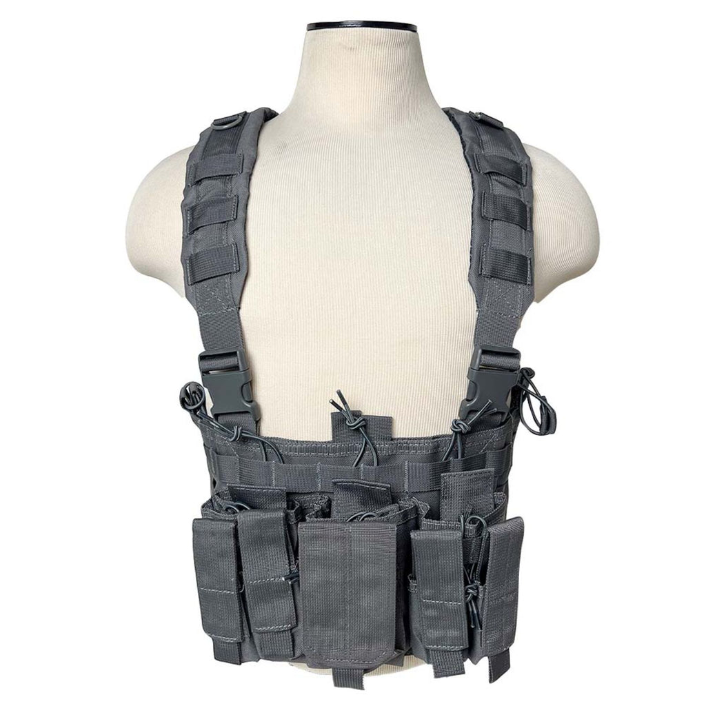 The NcSTAR Vest AR and Pistol Chest Rig features integrated rifle and pistol magazine pouches. This chest rig is completely adjustable for the proper fit and comfort while carrying your loadout kit. It includes three dual AR magaine pouches with bungee cord retention straps for each of the magazines. The vest will hold up to six metal or polymer AR15 30 round magazines. In front of each of the AR magazine pouches are two pistol magazine pouches for standard capacity pistol double stack magazines with adjustable hook and loop flaps for carrying a mix of 6 pistol magazines, small flashlight, pocket knife, or multi-tool in front of the chest rig. One central compartment behind the magazine pouches is great for storing additional gear and documents. Also, on the inside of the chest rig is another mesh pocket. The padded shoulder straps are fully adjustable for length to adjust how high or low the chest rig sits on the chest. The shoulder straps have top mounted quick connect buckles and two side swiveling quick connect buckles for a more ergonomic fit. The shoulder straps cross over at the back for a more secure fit. Each of the shoulder straps have metal D-rings and three rows of MOLLE for attaching addtional accessories to the shoulder straps. A waist strap with quick connect buckles is adjustable up to 66 inches to fit over most gear and body armor. On each side of the magazine pouches are 4 rows x 3 columns of MOLLE webbing for attaching MOLLE compatible gear and accessories.